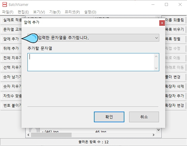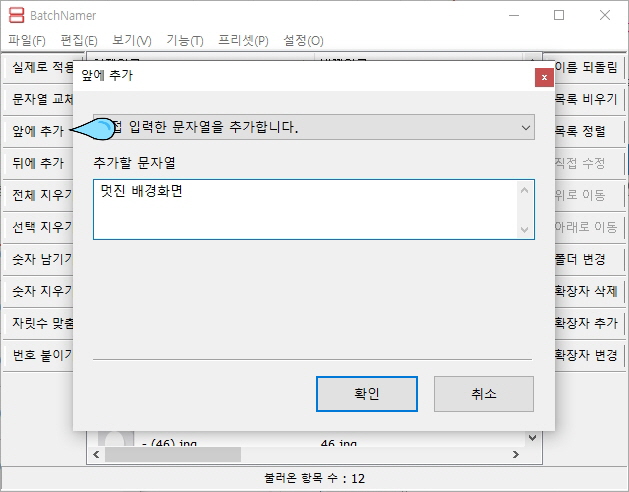 -그리고 '앞에 추가'를 클릭해서 파일명 앞에 붙을 문자열을 입력합니다.