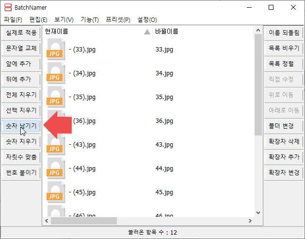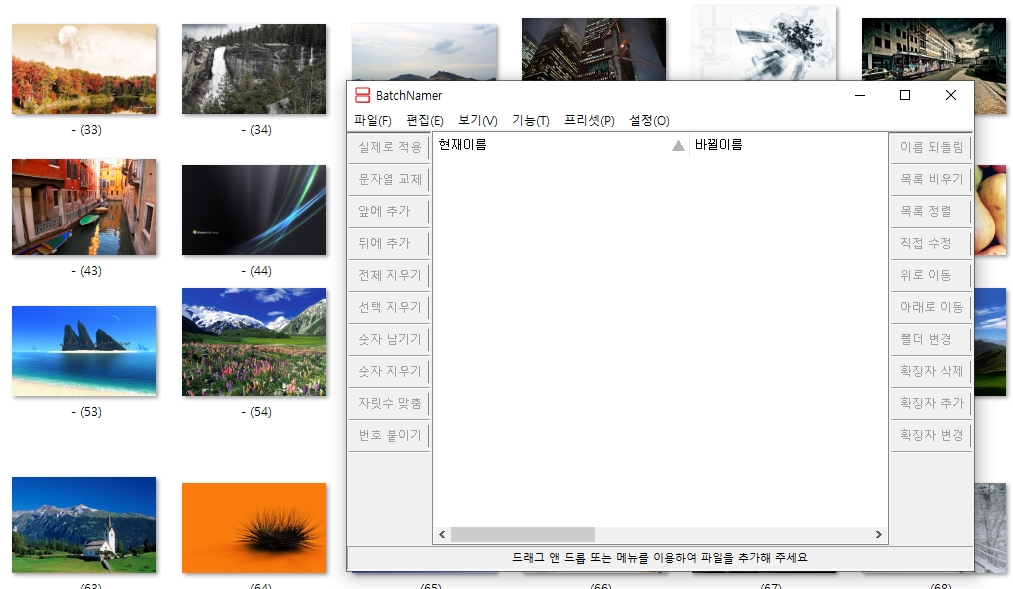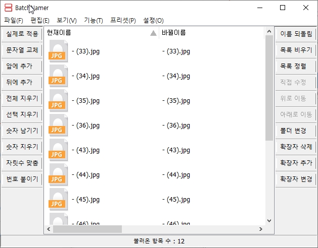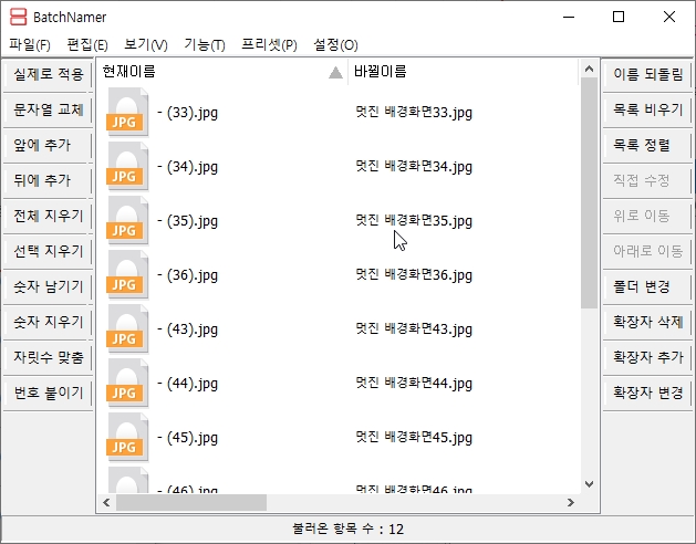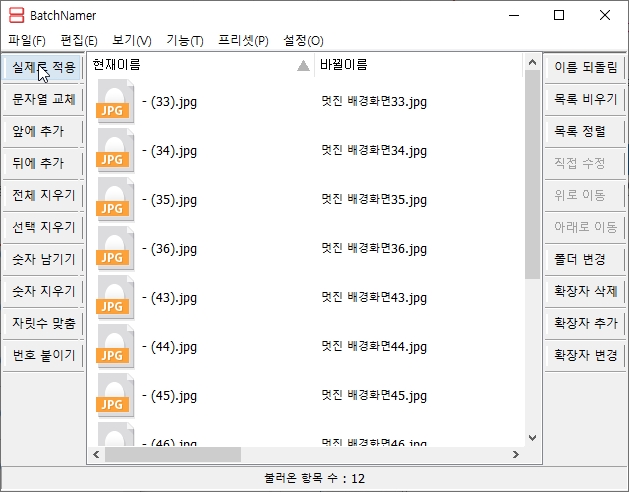 batch로 작업할 수 있는 것은 파일 앞에 글 추가, 뒤에 글 추가, 전체 이름지우기, 선택지우기, 숫자만 남기기, 숫자만 지우기, 자릿수 맞춤, 번호 붙이기 등이 있구요. 변경을 이름을 뒤돌린다거나, 확장자를 삭제, 추가, 변경할 수도 있습니다.