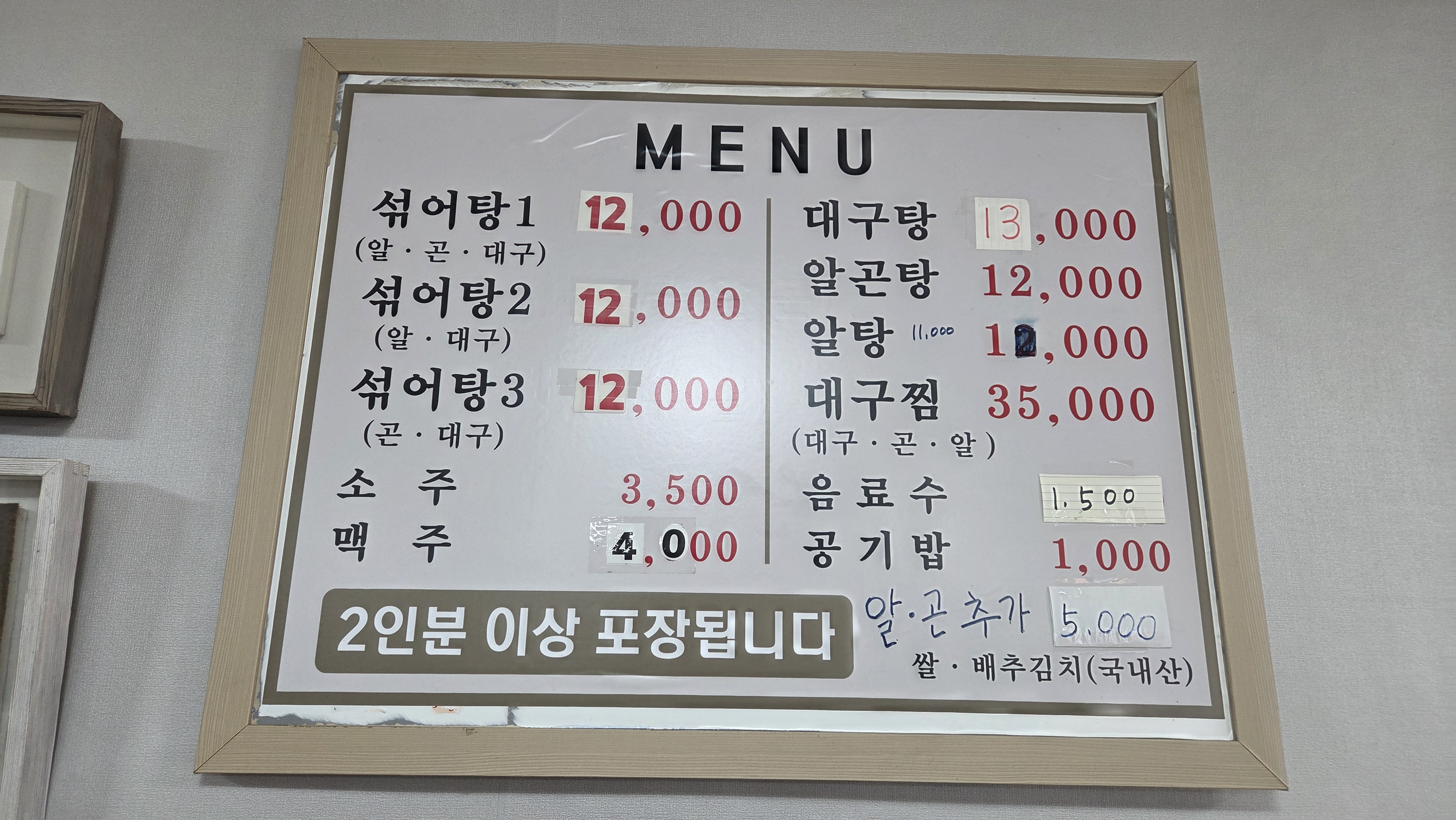청학식당의 메뉴~~ 섞어탕1,2,3과 대구탕, 알곤탕, 알탕, 대구찜이 준비되어 있구요. 알과 곤이는 추가할 수 있습니다. 2인분 이상 포장도 가능하구요. 가격이 조금씩 오르고 있지만, 다른 대구탕 식당 대비 비싼 편은 아닌 것 같아요.. 그리고 재료가 소진될 경우 조기에 마감이 될 수도 있습니다. 오후 2~3시 사이에 방문하실 경우 미리 전화를 하고 오시는 것도 좋을 듯요.. 대구탕을 제외한 나머지 탕류는 12,000원, 대구탕은 13,000원, 대구쯤은 35,000원입니다. 쌀과 배추김치는 국내산을 사용하고 있습니다.