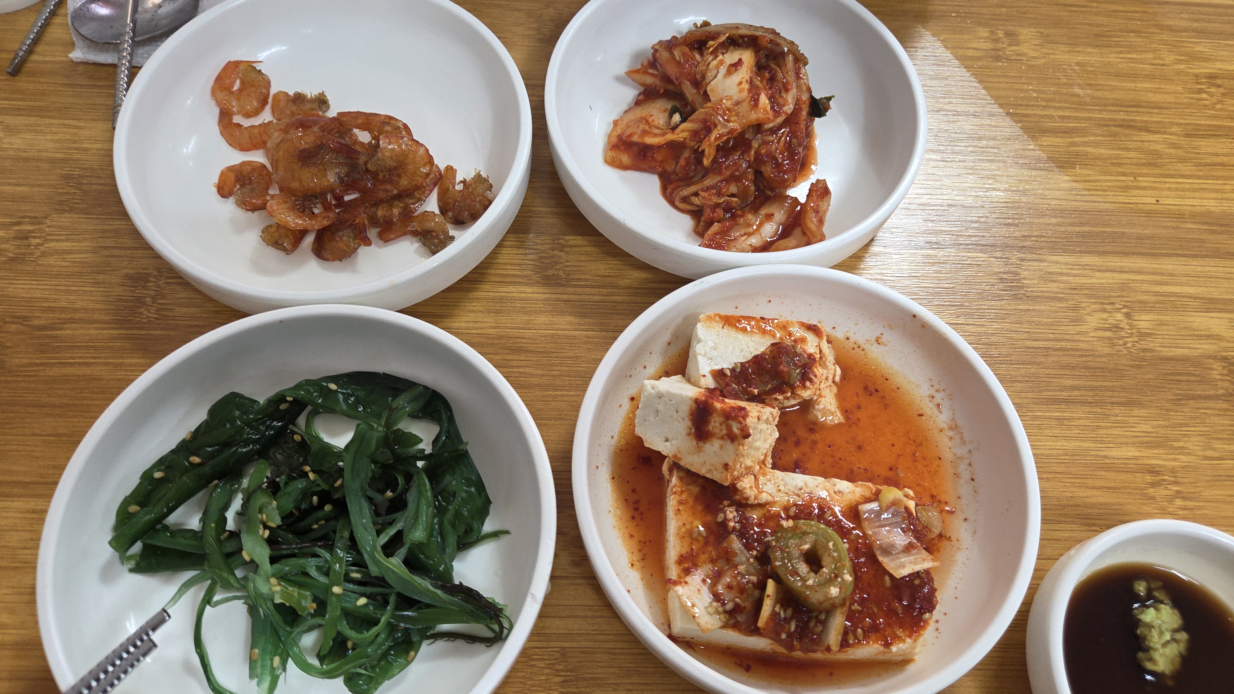 우리는 알과 곤이, 대구살이 들어간 가장 인기 메뉴 섞어탕1을 주문하였고, 주문과 동시에 반찬 등장이요.. 찬으론 새우볶음, 배추김치, 미역무침, 와사비간장 그리고 이 집의 시그니처 반찬 양념장 두부가 나왔어요.. 일단 두부 한입...